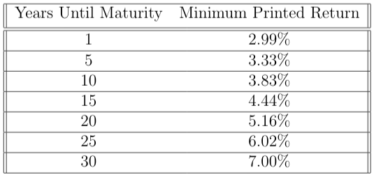 As we can see, the bond won’t even outpace inflation (estimated at 3% yearly) unless the printed return is at least 1.2%. Further, it is worth noting that this is only the case when the bond is held until maturity. It is NOT worthwhile to monitor the performance of other investment vehicles and cash the bonds if it becomes unsatisfactory. For this to be a meaningful investment, we must know 30 years in advance that: (1) we will not need this liquidated, and (2) we are comfortable with not only the current rate of inflation, but also all the annualized rates of inflation for the next 30 years.